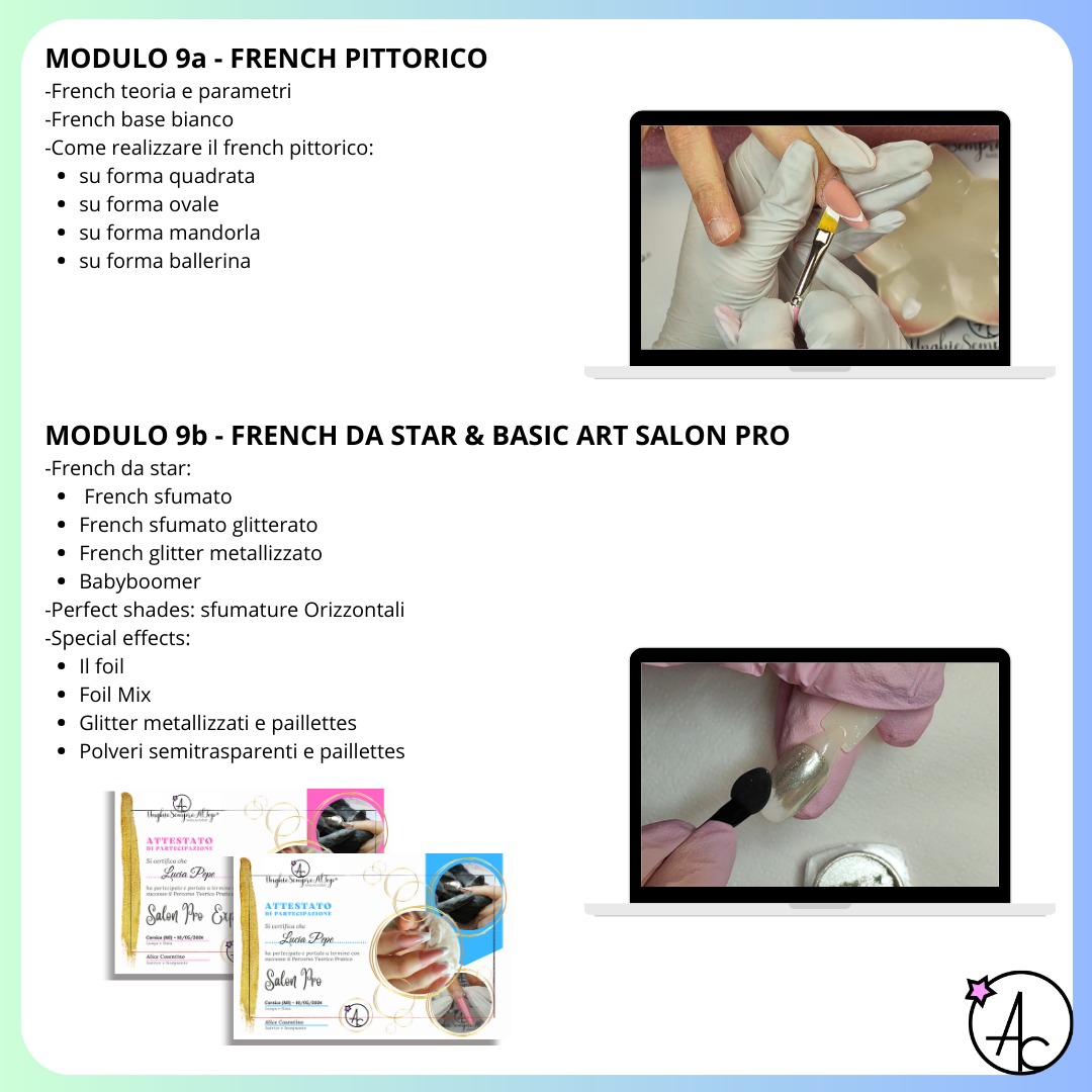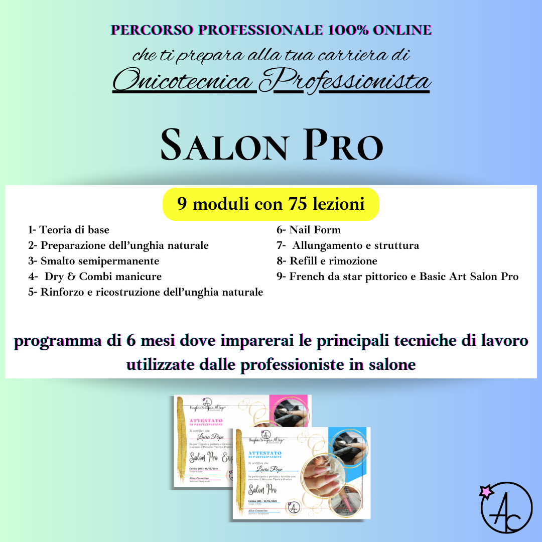 Il percorso Salon Pro è studiato per creare una figura competente capace di soddisfare tutte le esigenze tecniche e artistiche per il lavoro in salone. L’onicotecnica che lavora in salone deve essere in grado di lavorare con precisione e professionalità in tempi ragionevolmente ristretti, per questo motivo dovrà essere in grado di realizzare ricostruzioni, rinforzi e riparazioni ungueali, ma anche nail art di impatto senza perdere la cognizione del tempo.